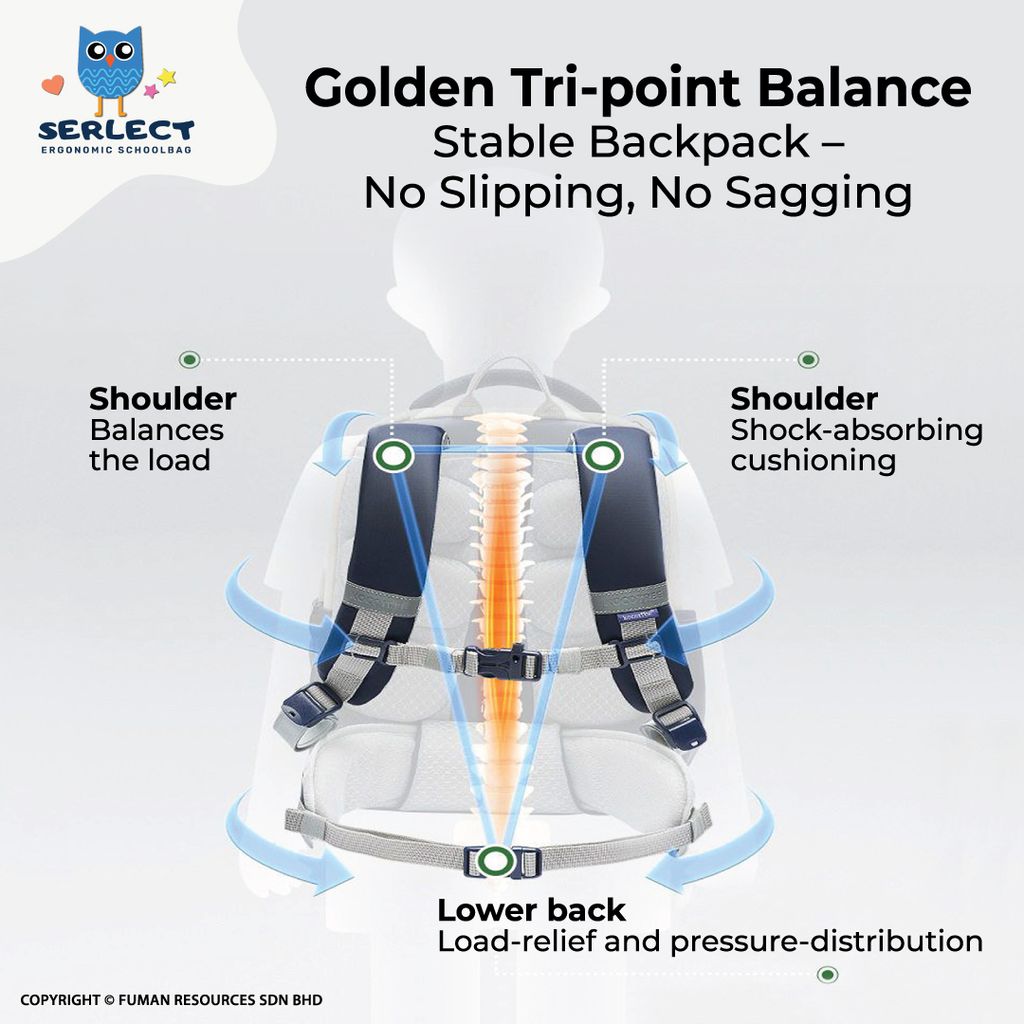 , featuring the Tri-Point Balance Design and an advanced 6-Point Load-Reduction System — engineered for optimal comfort and ergonomic spine protection for children.